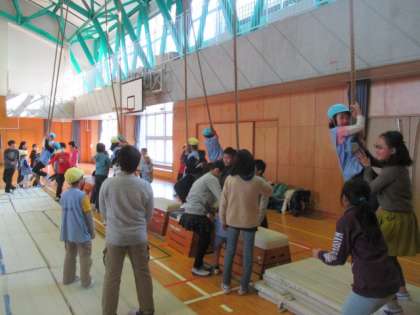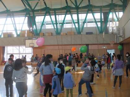 体育館の遊びは、ターザン、風船遊び、こまやけん玉などの昔遊びです。園児の子どもたちは、お兄さんやお姉さんに教わりながら、いろいろなことに挑戦していました。