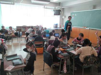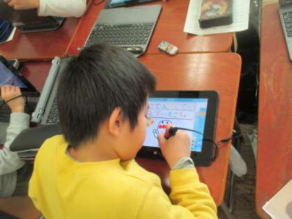 3年1組では一人に一台タブレットを使っての授業をしていました。インターネットで調べたり、タッチペンで絵や文字を書いたりして、楽しそうに学んでいました。子どもたちはICT機器をどんどん使いこなし、スキルを身につけます。これからもいろいろな教科の授業で、タブレットを使っていきます。