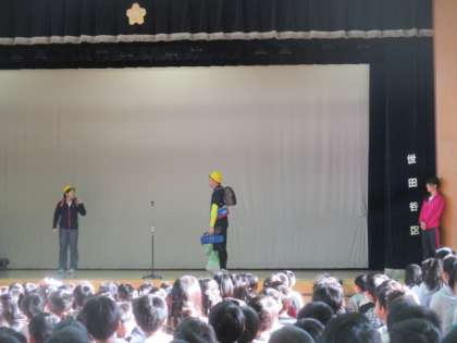 今週の看護当番の先生からは、「計画的に荷物を持ち帰ろう」とう目標が、利根川先生と根岸先生の寸劇を交えて伝えられました。子どもたちはみんな大爆笑していましたが、大事なことはよく理解できたようです。2学期も残り2週間を切りました。各クラスでは学習のまとめをしていますが、必要のない学習道具などを今日からでも少しずつ持ち帰って整理しておいてください。