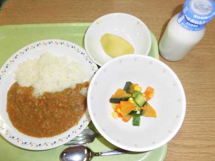 「キーマカレーライス、パンプキンサラダ、ラ・フランス、牛乳」です。