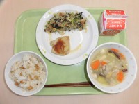 「五目ごはん、いかのかりんと揚げ、野菜のごま味噌かけ、煮豆、牛乳」です。