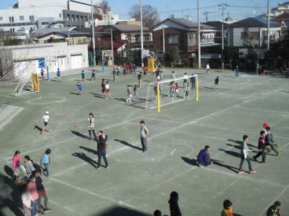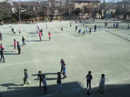 気持ちよく晴れ渡った中休みの校庭では、みんな元気に外遊びをしていました。少し気温が高めだったこともあり、上着を脱いで遊んでいる子が多かったようです。冬晴れの空に、楽しい笑い声が響き渡っていました。