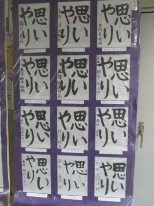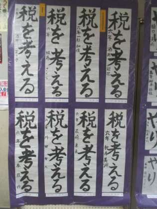 「税を考える週間」小学生書道作品展に出品した作品を、1階の廊下に掲示しました。入選した児童の作品も展示されています。入選者の学校での表彰は、明日の終業式の後に行います。