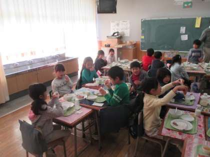 今日で2学期の給食は最後になります。今日のメニューは、クリスマスということもあり、「ローストチキン」です。どのクラスでも、みんなおいしそうにかぶりついていました。毎日おいしい給食を作ってくれた給食室の皆さん、ありがとうございました。3学期もよろしくお願いします。