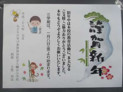 平成28年、新しい年が始まりました。元旦から晴天が続き、穏やかな1年のスタートになりました。今年も八幡山小学校の教育活動にご理解・ご協力をいただきますよう、どうぞよろしくお願いいたします。