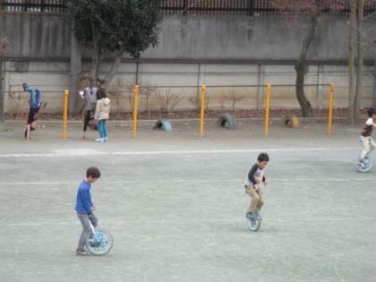 冬休みの静かな校庭では、学童クラブや新BOPの子どもたちが遊んでいました。今日は曇り空でちょっと肌寒い1日でしたが、みんな元気に一輪車に乗ったり、ボール蹴りをしたりして楽しんでいました。風邪をひかないように、手洗い・うがいもしっかりしてくださいね。