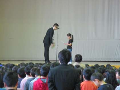 3学期から2年生に新しい友達が転入し、紹介されました。また、校長先生からは、読書記録カードの1年間の目標冊数を達成した2年生の児童の紹介がありました。低学年の目標100冊を達成した児童は初めてだったそうで、お手製の表彰状が手渡されました。他の学年の児童もがんばってたくさんの本を読んでくださいね。