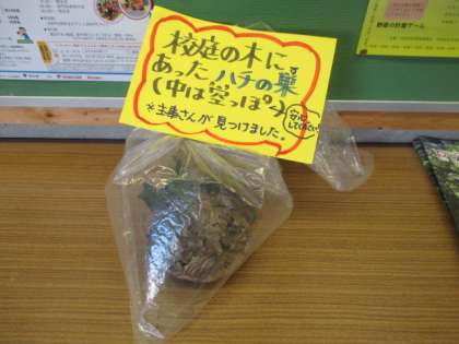 校庭の木の手入れをしている主事さんが、蜂の巣を見つけました。中身は空でそんなに大きいものではないですが、しっかり巣の形にはなっています。あらためて八幡山地域は、緑の多い自然豊かな所なのですね。