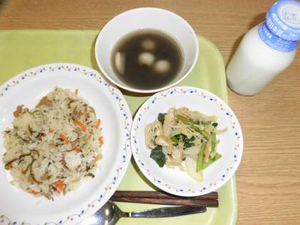 「豚肉とごぼうのごはん、きのこ入り煮びたし、白玉しるこ、牛乳」です。