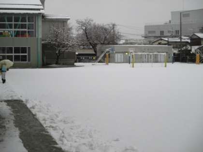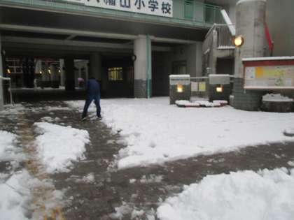 未明からの雪で、校庭は一面真っ白です。しかし、登校前の時間には雨になったので、子どもたちが安全に登校できるように、先生たちは正門・南門前や通学路などの雪かきをして子どもたちを迎える準備をしました。子どもたちも元気に登校してきました。