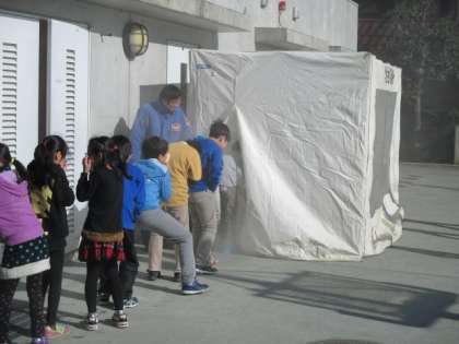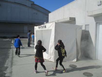 全体の訓練の後、引き続き4年生は校庭で煙体験を行いました。火事の際の煙の怖さ、避難の仕方について、子どもたちは実際に訓練用の煙の中に入って実感することができました。
