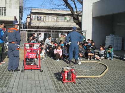 お話のあとには、防災倉庫や防火水槽、ポンプの説明をしていただき、見学しました。