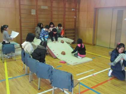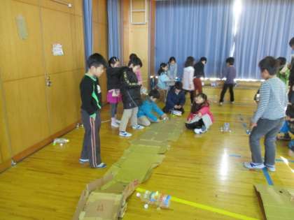2年生は、2学期の後半から作ったおもちゃを使って、1年生を招待しての交流を体育館で行いました。自分たちの作ったおもちゃを説明しながら、優しく遊び方を教えます。お兄さん、お姉さんとしてしっかり振る舞い、1年生を楽しませていました。