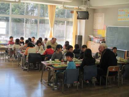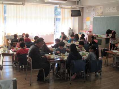 昔遊び体験でご協力いただいた地域の方々とのふれあい給食が、1年生の各教室で行われました。今日のメニューはカレーです。楽しかった昔遊びに会話も進み、そして大好きなカレーに食も進んで、楽しい会食になりました。ゲストティーチャーとしてご来校いただきました地域の皆様、本日は寒い中、長い時間ありがとうございました。今後も本校の教育活動にご協力いただきますよう、よろしくお願いします。