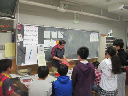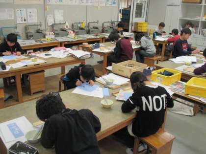 6年3組は、図工の「うつして見つけた私の世界」という単元で、彫り込み版画の課題に取り組んでいました。彫りと刷りを繰り返して、色の重なりや彫り方に注意しながら、自分なりの表現を工夫します。みんな作業に集中して、真剣な表情で授業に臨んでいました。