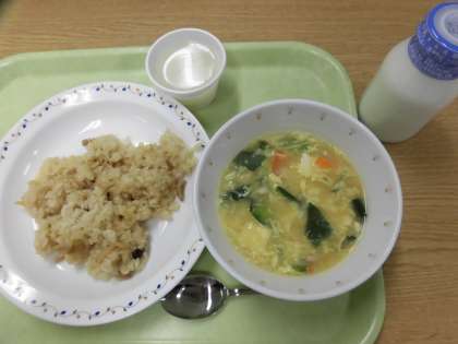 「中華おこわ、中華風コーンスープ、ホワイトゼリー、牛乳」です。