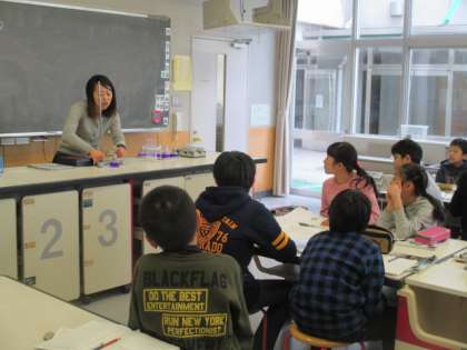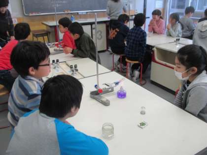 4年2組では、理科の実験の授業。水を熱したときのあたたまり方について勉強しました。まずは、実験の準備のための説明を聞きます。その後、班で協力して実験が始められました。アルコールランプにマッチで火をつけるにも一苦労でしたが、みんなで助け合って実験を行い、しっかり観察して結果の考察もできました。さすが4年生。理科室でも、きちんと約束を守って課題に取り組むことができました。