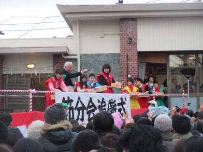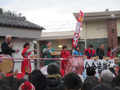 いよいよ、八幡山小の年男・年女の子たち、保護者の方々の登場です。太鼓の合図で、「鬼は外、福は内」のかけ声のもと、いろいろな品がまかれます。子どもたちも笑顔でいっぱいです。