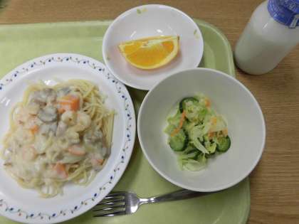 「スパゲティクリームソース、フレンチサラダ、ネーブルオレンジ、牛乳」です。