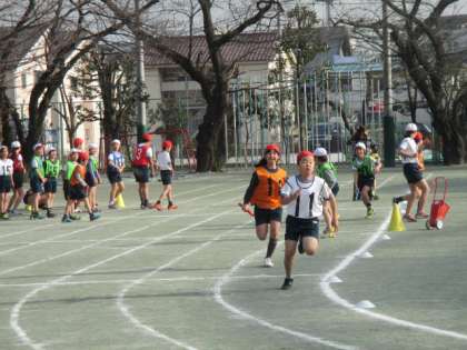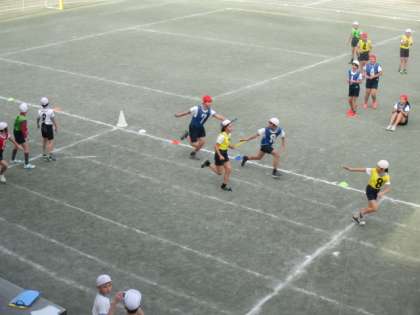 球技の後は、各クラス対抗のリレー競走です。校庭に全員集結し、大歓声の中でレースは始まりました。ここではさすが6年生、5年生にリードを許しません。2レース行われましたが、いずれも6年生が上位を独占していました。