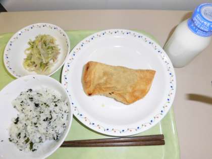 「わかめごはん、ジャンボ餃子、白菜の中華サラダ、牛乳」です。