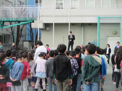 昨日の暖かさから一転、今朝は風が冷たく、寒い朝になりましたが、全校朝会は校庭で行いました。校長先生からは、「睡眠」についてのお話。充実した学校生活を送るためには、十分な睡眠は不可欠であるということ。今流行しているインフルエンザに負けない体力と免疫力をつけるためにも、しっかりと寝ることが大切です。しっかり寝て、元気に体を動かし、そしてしっかり食べ、今週も元気にがんばりましょう。
