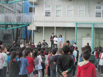 校長先生のお話の後、今週も頑張っている子どもたちの表彰がありました。バレーボールチームの大会で優勝をした、八幡山小の選手たちが紹介されました。全体の朝会の後、3年生から5年生の児童はその場に残って、来年度のクラブ活動についての説明を受けました。特に3年生は初めてのクラブ活動になります。明日は実際にクラブの見学もあります。どのクラブに入るか、よく考えて決めてくださいね。