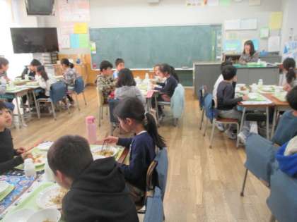 インフルエンザでお休みしていた友達も少しずつ戻ってきました。今日の給食は、みんなの大好きな焼きそばです。1年生もしっかりおかわりをしている姿が見られました。もりもり食べて体力をつけ、インフルエンザに負けない健康な身体をつくりましょうね。