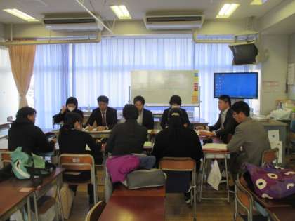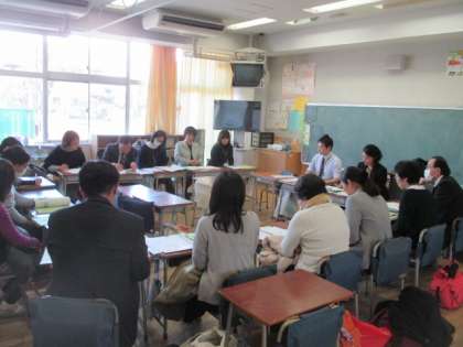 授業後の各教科部会での話し合いの様子です。先生方はみんな真剣に今日の授業について、議論を交わしていました。また、今日は1年間のまとめとして、各教科での取り組みについても話し合いが行われました。