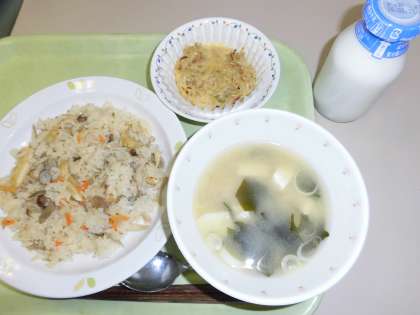 「きのこごはん、切干大根の卵焼き、味噌汁、牛乳」です。
