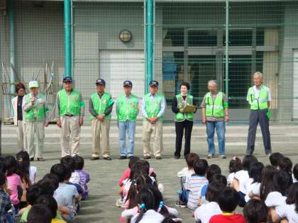今朝は、朝会で地域の皆さんを紹介しました。子どもたちの登下校や地域での遊びの見守りをしてくださっている八幡山町会防犯部の「安全パトロール」の皆さんと、上北沢や桜上水地域で「ワンワンパトロール」をしてくださっている皆さんです。(皆さんの中に、大事なワンちゃんも入っています。)