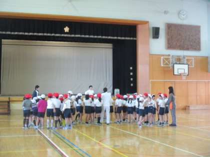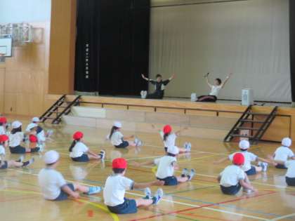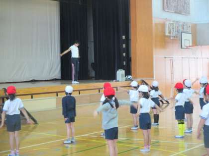 5校時、2年生はゲストティーチャーの授業で、体操教室を行いました。世田谷区のスポーツ指導員で、健康運動指導士・親子体操指導員の関沢祥子先生をお招きして、みんなで行う楽しい体操を教えていただきました。まずは、しっかり整列してあいさつです。準備運動から、しっかり体を動かします。結構ハードです。