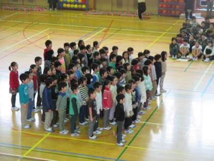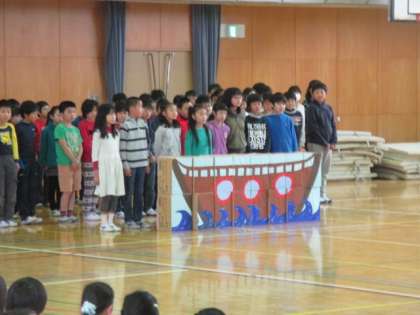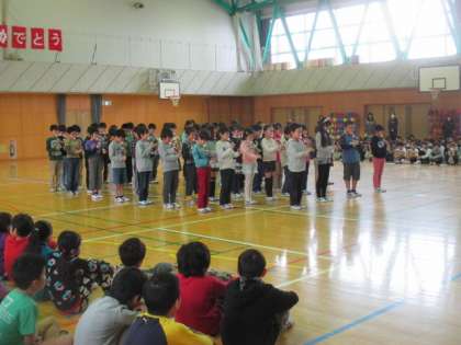 続いて、各学年からの出し物です。2年生は、6年生に感謝の気持ちを込めて呼びかけます。3年生はリコーダーと運動会のダンスを交え、4年生は学芸会の小道具を使っての呼びかけでした。