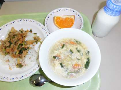 「豚キムチ丼、にらたまスープ、せとかオレンジ、牛乳」です。