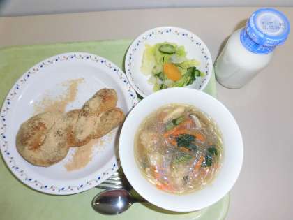 「きな粉揚げパン、肉団子入り春雨スープ、フレンチサラダ、牛乳」です。