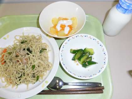 「塩焼きそば、きゅうりの中華味、フルーツヨーグルト、牛乳」です。
