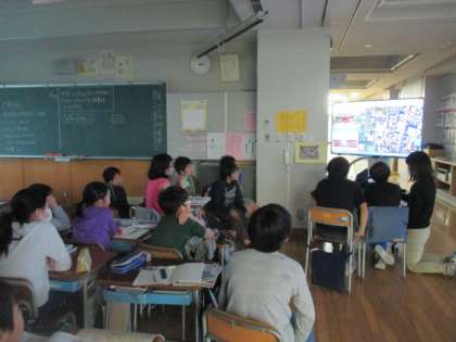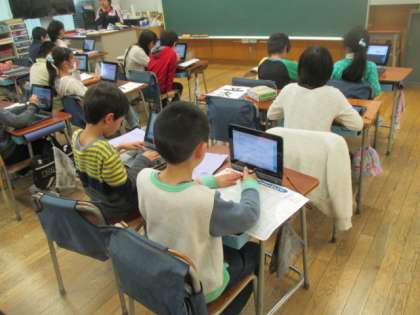 3年生では、子ども一人に一台のタブレットを使って、総合の授業の調べ学習を行っていました。ローマ字表をかたわらに置いて、自分の興味のあることを入力し、インターネットで夢中になって調べていました。4年生は、社会科の東京都の下町の学習で、インターネットのサイトマップを使用し、現地の様子をモニターに映して学習していました。先生方も子どもたちも、ICTを上手に活用して授業に取り組んでいます。