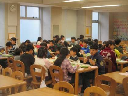 6年生とのお別れ給食、今日は1年3組と6年3組で行われました。テーブルに向かい合い、楽しいおしゃべりをしながらの会食です。1年生は6年生のお兄さんやお姉さんにたくさん遊んでもらって、この1年で思い出がたくさんできました。今日の給食も楽しい思い出の1ページになったことでしょう。