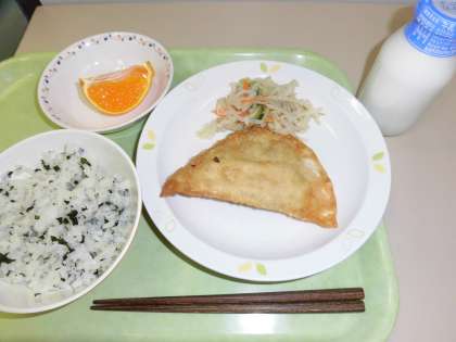 「わかめごはん、ジャンボ餃子、かみかみ塩ナムル、デコポン、牛乳」です。