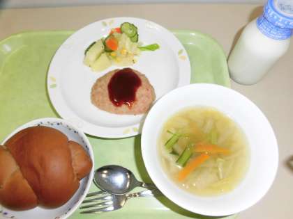 「ココアパン、ハンバーグ、ポテト入りフレンチサラダ、野菜スープ、牛乳」です。