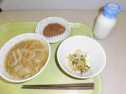 「札幌ラーメン、小松菜サラダ、おからマフィン、牛乳」です。