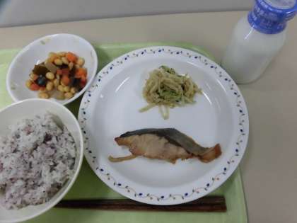 「ゆかりごはん、鰤(ぶり)の照焼き、ごま酢かけ、五目豆、牛乳」です。