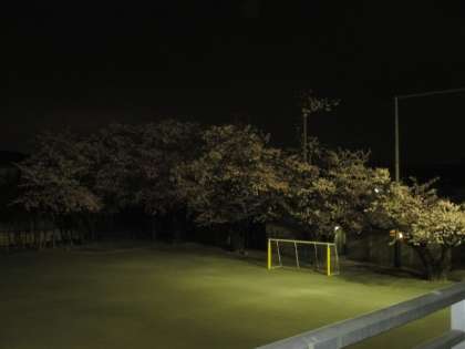 校庭の桜もほぼ満開になりました。土曜日は八幡山FCの練習が遅くまで行われていて、ナイター照明がつきます。桜の花もちょっとライトアップされて、とてもきれいです。