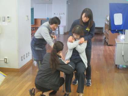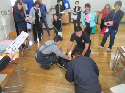 さらに万が一を想定しての児童への対応についても確認しました。食物アレルギーでアナフィラキシーを疑う症状が出た場合を想定し、先生方の動きや役割、流れを確認しながら、実際に訓練をしました。エピペンの使い方についても、練習用の器具を使ってグループで演習しました。新学期を迎える前に有意義な研修ができました。