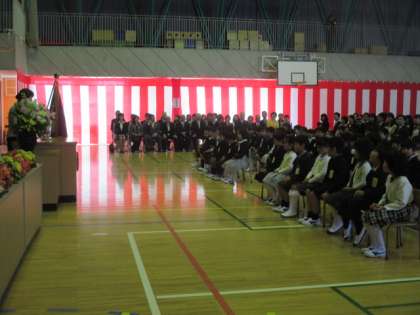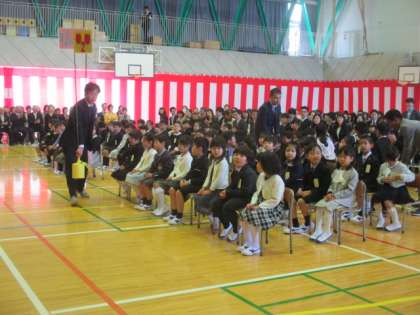 始業式の後、10時30分から新1年生の入学式が行われました。1組から入場です。たくさんのお客さんの前でちょっと緊張気味の1年生でしたが、校長先生のお話をしっかり聞くことができ、とても立派でした。