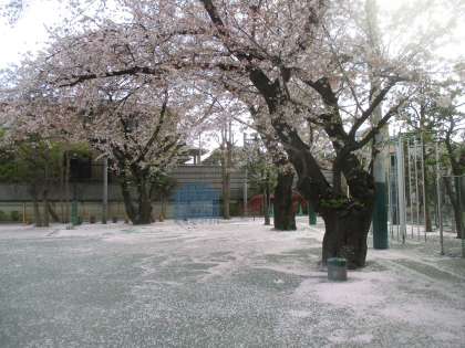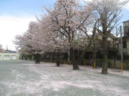 昨日の風雨で、校庭の桜の花はだいぶ散ってしまいましたが、木の下は一面ピンクのじゅうたんが敷き詰められているようです。