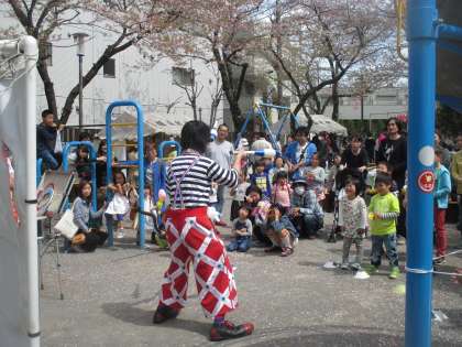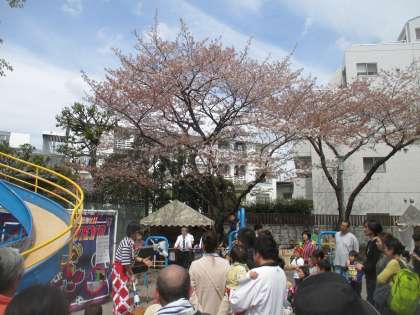 先週の上北沢桜まつりに続き、今週は八幡山地区の桜まつりが行われました。八幡山団地入口小公園には、所狭しとたくさんの出店が並び、たくさんの来場客でにぎわっていました。お昼過ぎの会場では、地域の商店会の主催する福引きやイベントなどで盛り上がり、残りわずかとなった桜の花を愛でていました。授業を終えた八幡山小の子どもたちも駆けつけて、お祭りの雰囲気を楽しんでいました。