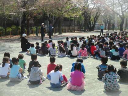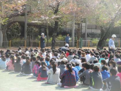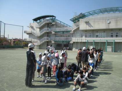 今年度初めての避難訓練は、地震の発生後の火災を想定したものでした。新しいクラスになって1週間しか経っていませんが、どの学年も「お・か・し・も」の約束をしっかり守って、上手に避難することができました。1年生も事前に校庭に並んで、上級生の訓練の様子を見学し、しっかり校長先生の話も聞けていました。みんな大変立派でした。