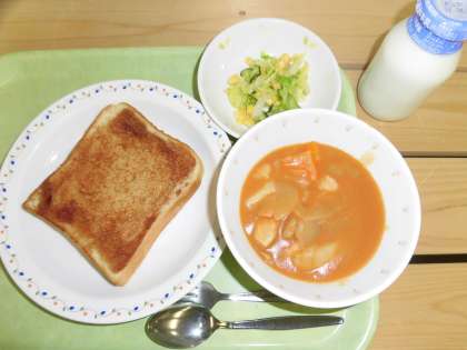 「シナモントースト、コーン入りフレンチサラダ、ビーンズシチュー、牛乳」です。