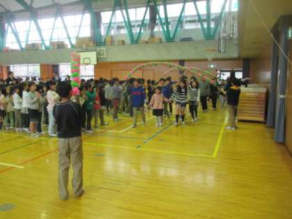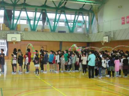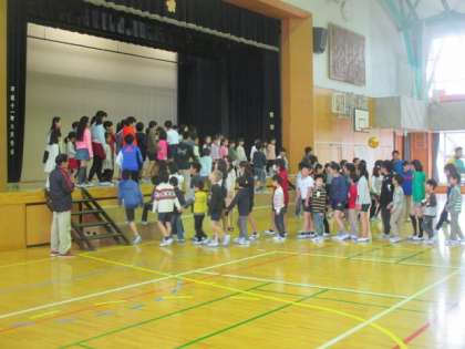 今朝の児童集会は、2年生から6年生の全校児童で1年生を歓迎し、八幡山小学校の一員として正式に迎え入れる会です。6年生に手を引かれ、1年生が元気に入場してきました。